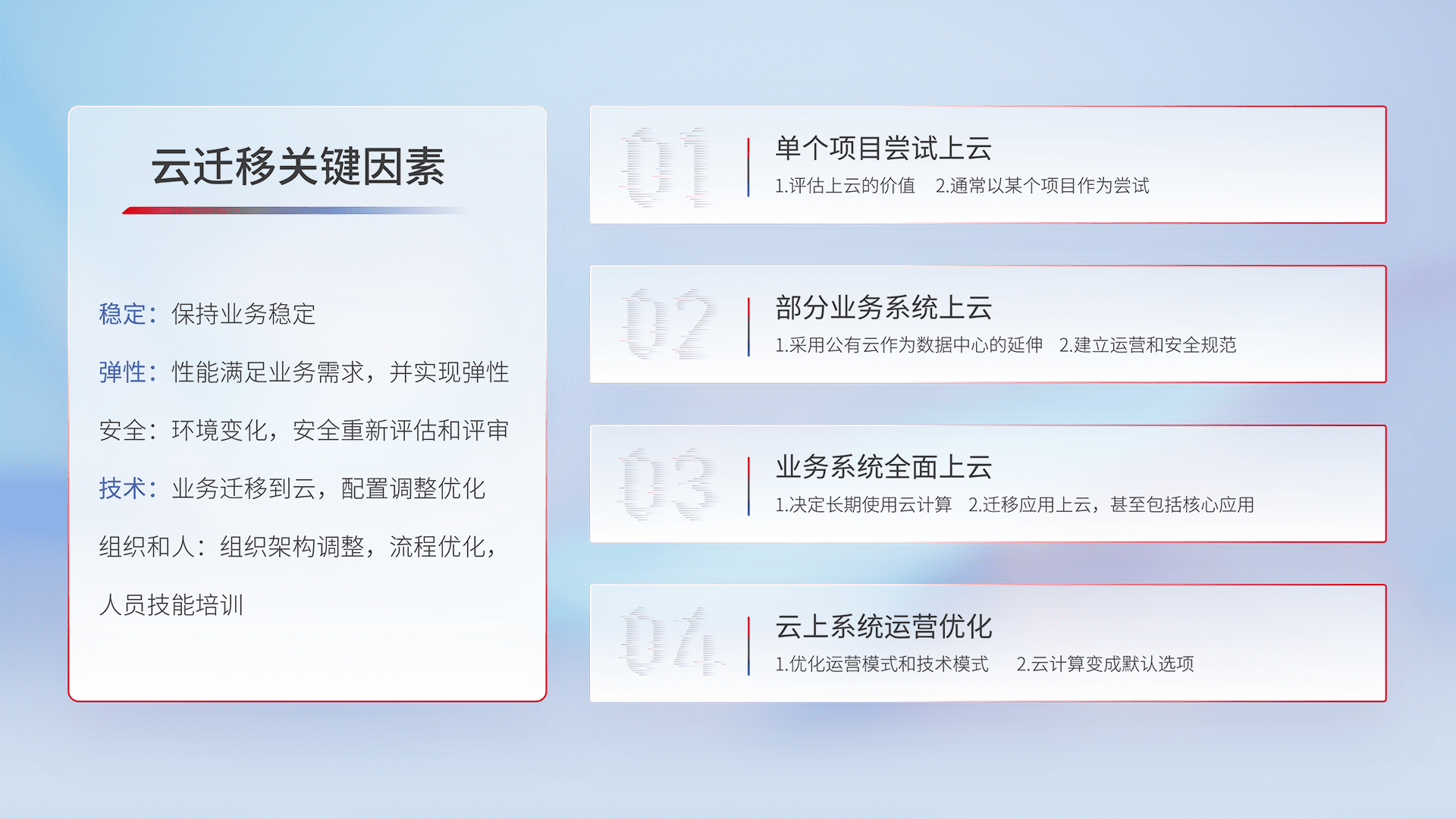 结合实际业务,,从规划设计、、云平台选型、、、云原生改造、、、数据迁移、、、集成交付,,迁移全过程为客户识别最佳上云路径,,,做好风险识别管理,,设计网络架构、、身份权限、、、安全审计合规、、、操作审计、、、日志审计、、、监控告警策略、、、多站点容灾设计等,,,对云上基础设施进行整体规划,,提升IT治理水平,,,,以满足弹性、、、、高可用、、高性能的需求。。。
